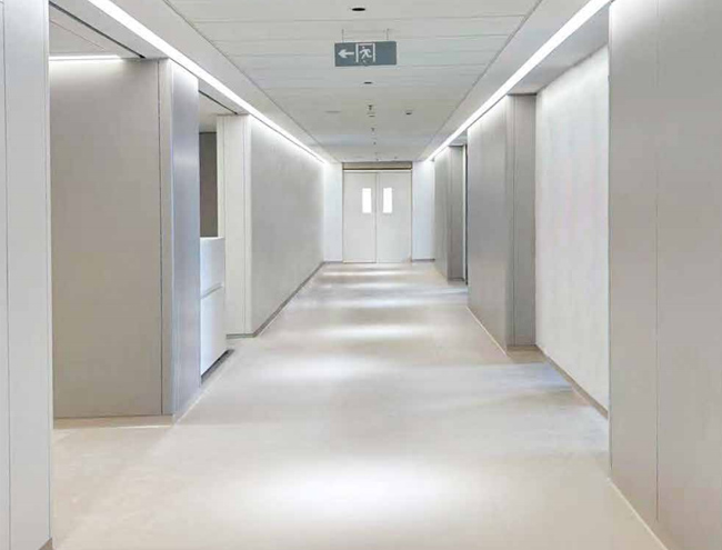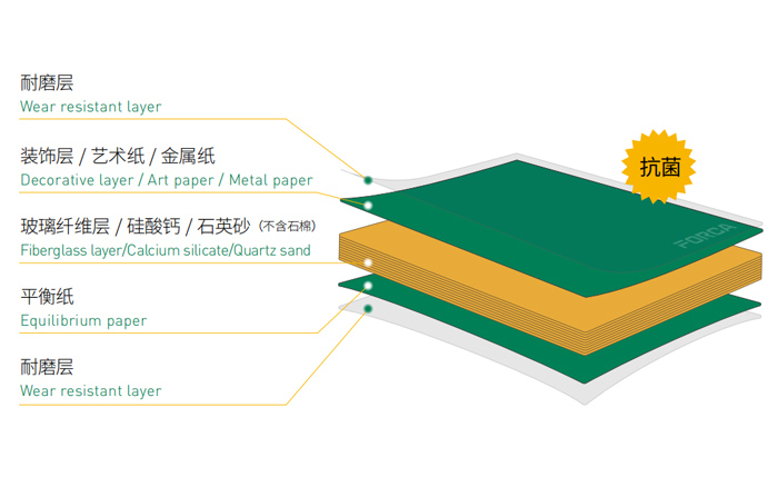 • 福爾卡?醫耐板?(玻纖復合不燃板)是由耐磨層、裝飾層、玻璃纖維層、硅酸鈣、石英砂(不含石棉)和平衡紙,表面經過三聚氰胺樹脂與特種改性樹脂浸漬層疊后高溫高壓而成,產品的密度不低于1650KG/m3,厚度從4mm 到12mm,形成了整體A級防火、密度高、硬度高、表面毛孔很小的纖維板。